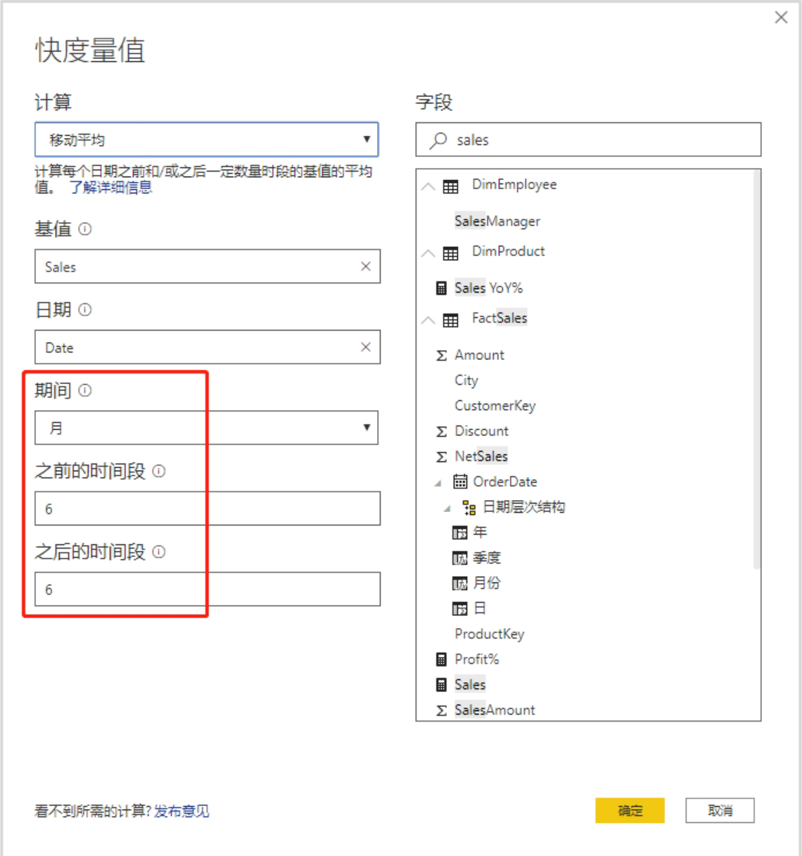 参照前面的步骤,再次打开“快度量值”对话框,将“计算”设为“移动平均”,然后参照图2.4.21配置参数,此处为计算12个月的月度销售平均值。
