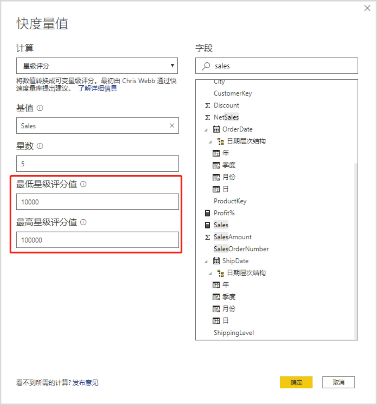 有趣的是,快度量除可以创建数值度量外,还可以创建非数值度量,如销售额的星级评分,如图2.4.23所示。该度量用于制订销售的评分标准,用户可以设置评分的星数、评分值范围。