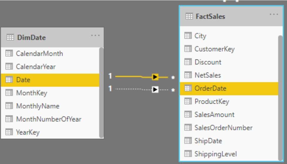 但DimDate表与FactSales表之间仍需要手动建立关系,这是因为表中没有“Date”字段。另外,Sales表中有“OrderDate”“ShipDate”两个日期字段,而Power BI不知道如何建立关系。