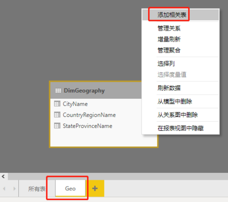 当模型中的表数量过多时,会导致表之间的关联变得复杂,不利于用户分析和理解表之间的关系。为此,新版Power BI提供了局部视图功能,单击图2.4.1下方的“+”按钮,即可添加一个新栏“Geo”。将表“DimGeography”从右侧面板中拖曳至窗口的中央区域,并在该表上单击鼠标右键,在弹出的快捷菜单中单击“添加相关表”命令,如图2.4.3所示。