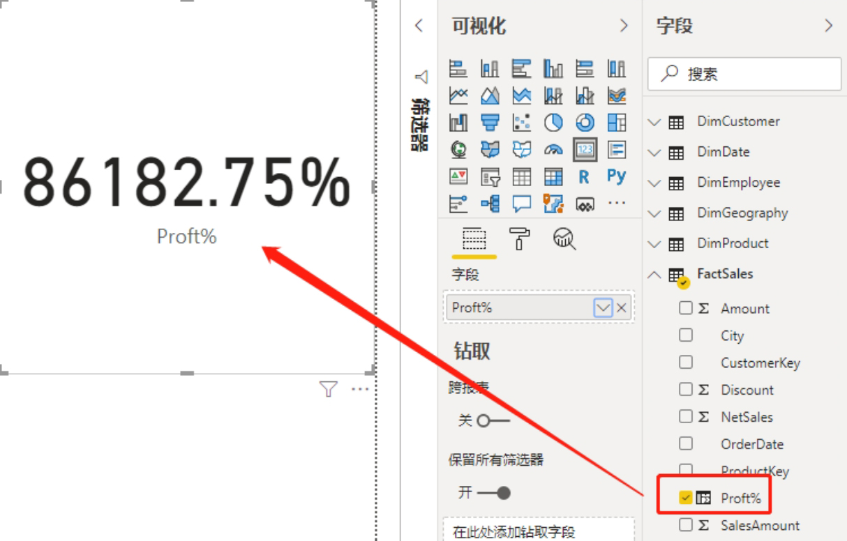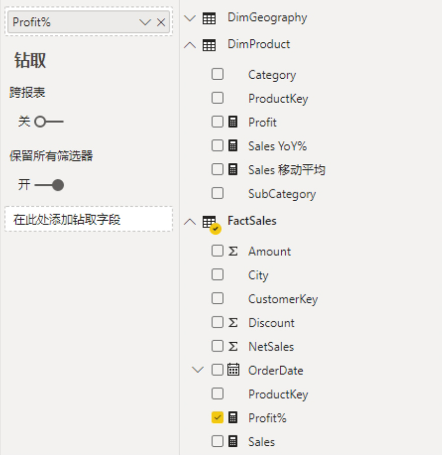 注意: 在度量公式中,“'”后面的是Table信息,“[”后面的是字段名称。Power BI有智能提示功能,按【Tab】键可以快速填充公式。Profit%度量是由Sales和Profit嵌套形成的。我们将这种通过公式完成的度量称之为显式度量。凡是显式度量,一定要使用Table[Field]指定字段名称,不能直接用[Field],否则容易产生计算错误。