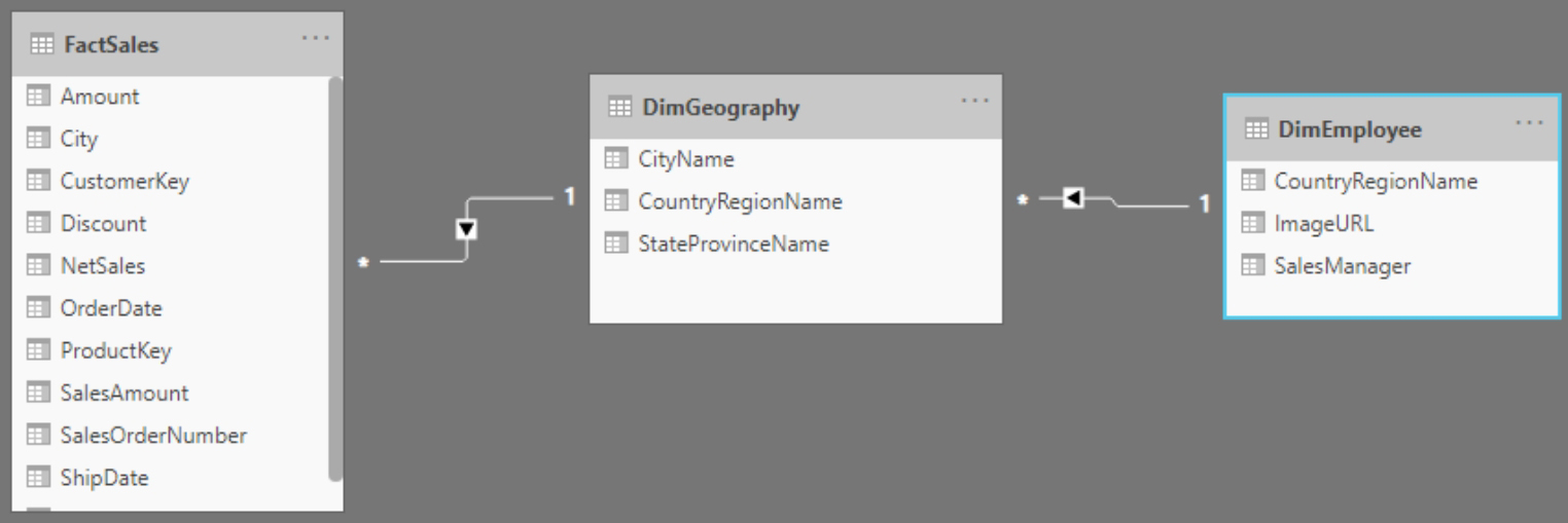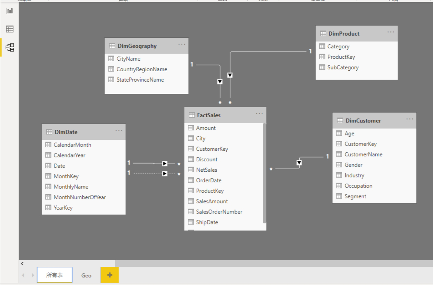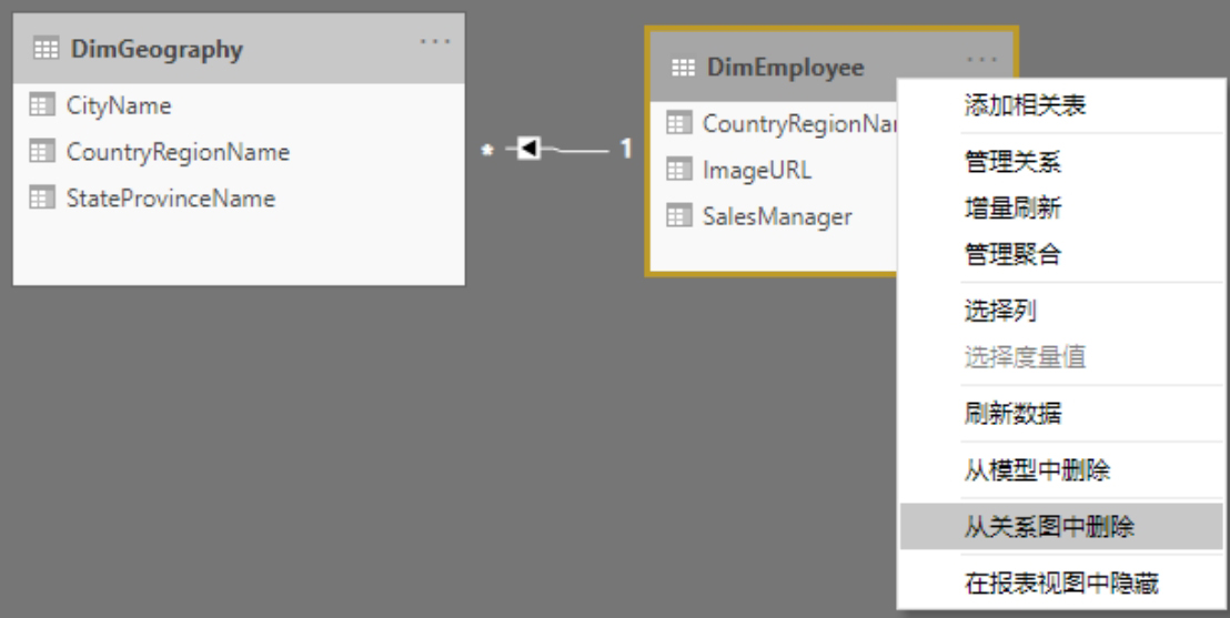 右击DimEmployee表,在弹出的快捷菜单中有“从关系图中删除”与“从模型中删除”两个命令,见图2.4.5。若选择“从关系图中删除”命令,则只是将报表从关系视图中移除,不影响整体的模型关系。若选择“从模型中删除”命令,则会影响现有的模型关系。如图2.4.6所示,在“Geo”视图中选择从模型中删除DimEmployee表后,DimEmployee表在模型中也消失了。