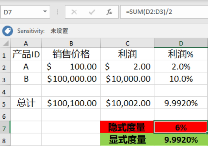为方便读者理解,图2.4.16对比了两种计算利润方法的差别。显然,第一种计算方法的错误之处在于其直接计算每一行的平均利润%,而第二种计算方法是分子和分母分别聚合,再相除。