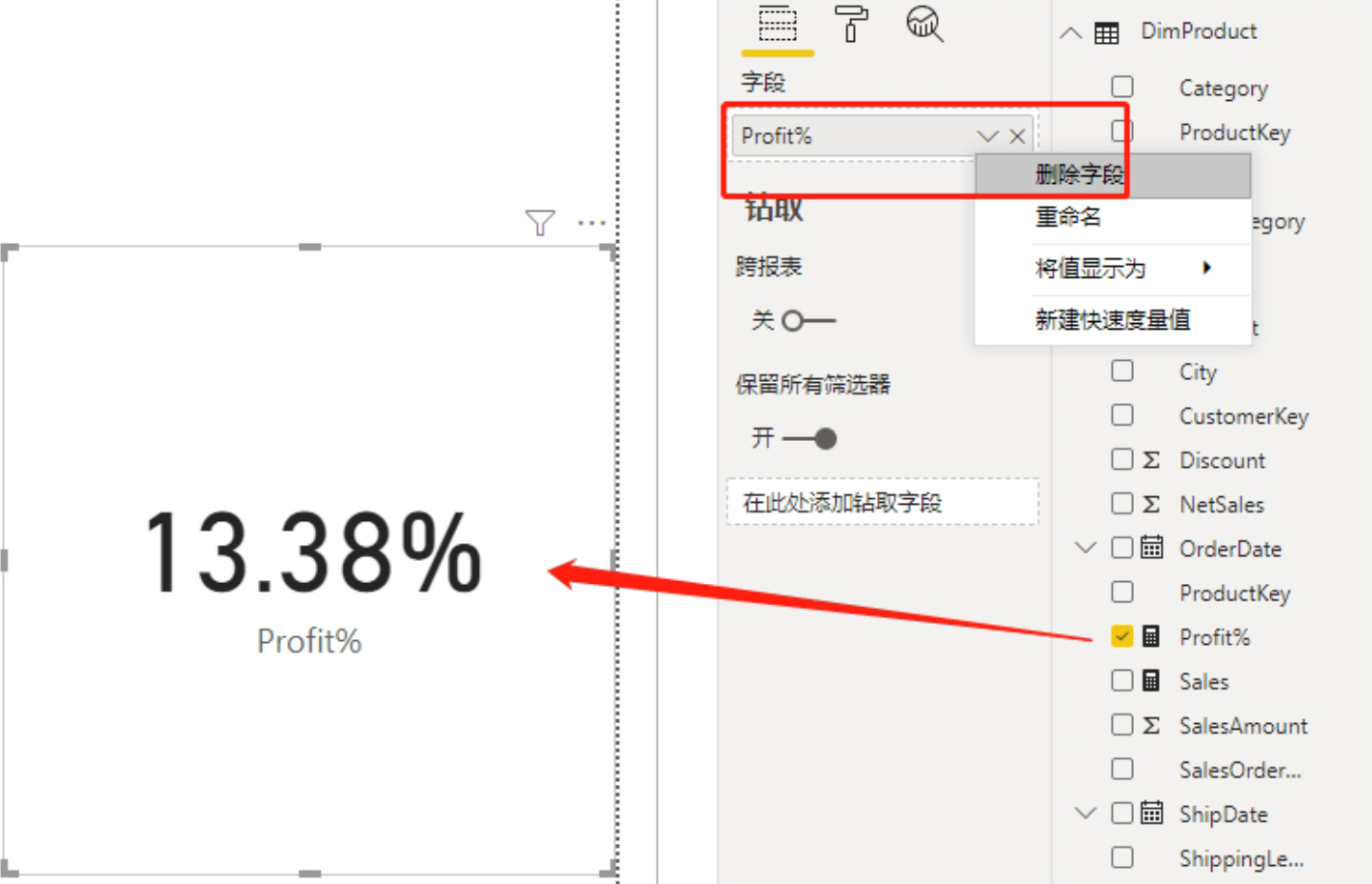 参照图2.4.15,将创建的Profit%度量放入卡片图中,注意,在显性度量下拉菜单中不再有聚合选项,因为公式中的SUM函数已经明确了聚合方式为求和。13.38%是正确的平均利润值。