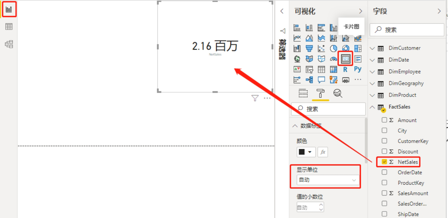 参照图2.4.9,先选择报表视图,即单击“卡片图”选项,将“NetSales”字段拖入可视化图中,显示结果为“2.16百万”(单位是可以设置的)。这就是销售利润汇总结果。