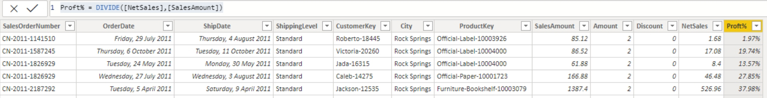 下一步计算利润率。回到“数据”视图中,选中FactSales表。选择“表工具→新建列”命令。在公式栏中输入公式Proft%=DIVIDE([NetSales],[SalesAmount]),单击列工具中的%符号,就新建了一个名为Profit%的利润率计算字段,如图2.4.11所示。图中每一行利润率是该行记录对应的利润率。DIVID公式为非除以0公式,即分母不可以为0,防止除数为0出错。