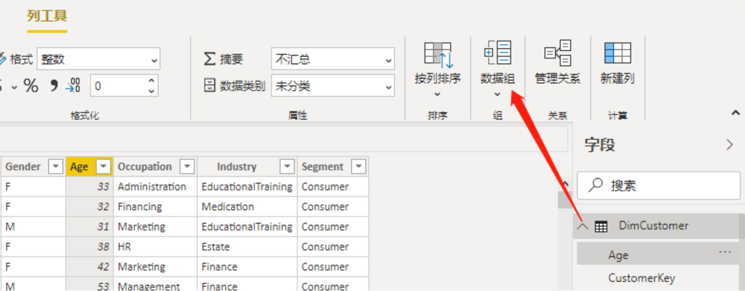 为了分析客户的销售贡献,需要将客户的年龄进行分组。在数据视图下,在DimCustomer表下选中“Age”字段,单击“列工具→组→数据组”命令,见图2.4.34。