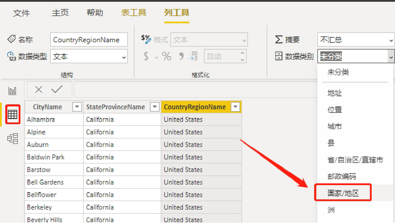 在数据视图下,在地理表中选中CountryRegionName字段,单击菜单中的“列工具→数据类别”命令,在打开的下拉菜单中选择“国家/地区”命令,见图2.4.38。依次选中City Name字段与StateProvinceName字段,并参照该方法选择对应的数据类别。
