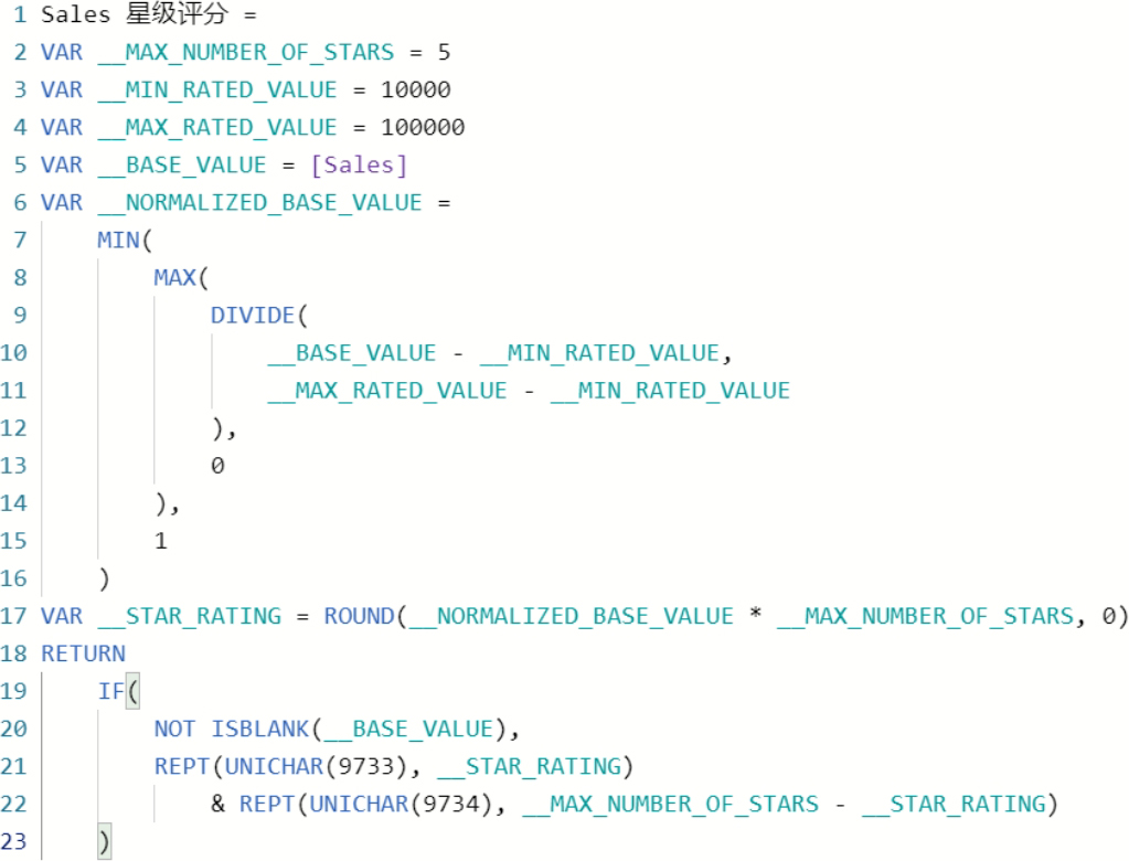 DIVIDE():分子为当前销售额值与销售额最小值之差,分母为销售额最大值与销售额最小值之差,结果为分子与分母的比率。