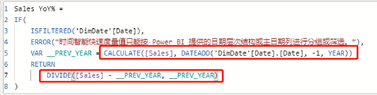 在字段栏中找到前面创建的同比值,在公式栏中观察其对应的代码,如图2.4.20所示。代码的核心是CALCULATE函数。该函数的作用是进行筛选上下文(Filter Context)的转换,其中筛选部分使用了DATEADD函数筛选去年同比值。VAR…RETURN函数中的VAR参数用于存储变量,RETURN参数用于输出变量计算结果。这种写法易于阅读和理解。