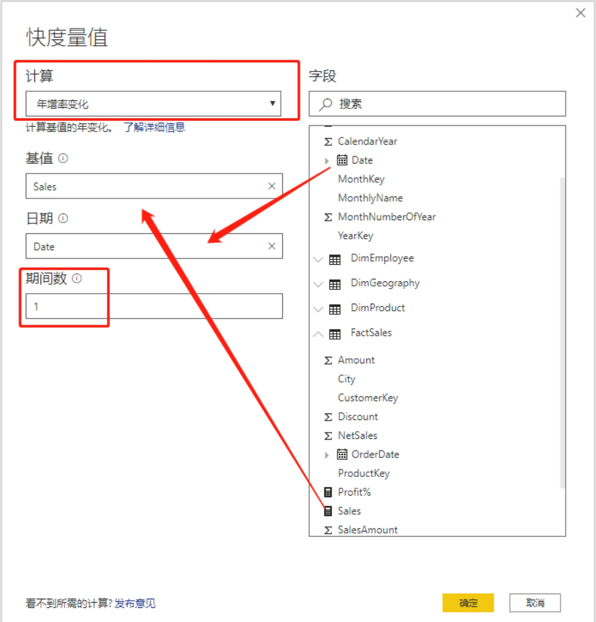 单击图2.4.18中的“快度量值”命令,在打开的对话框中将“计算”设为“年增率变化”,“基值”设为度量Sales,“日期”设为Date,“期间数”设为1,代表计算1个单位的年同比值,单击“确定”按钮完成,如图2.4.19所示。