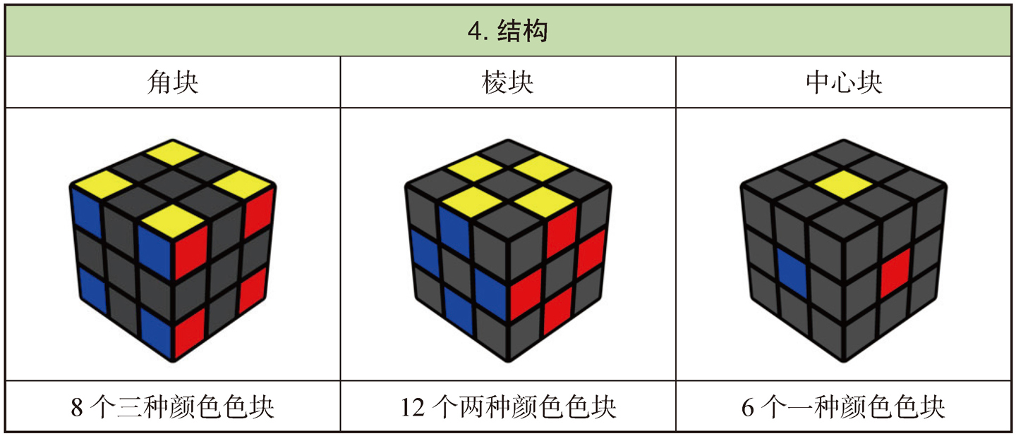 接下来我们要说的是复原魔方的一个重点:魔方的结构。魔方总共由三种块组成——角块、棱块和中心块。角块有三种颜色,棱块两种颜色,中心块一种颜色。角块、棱块和中心块数量分别有8个、12个和6个。其中,中心块能够确定这一面的颜色,并且中心块与轴相连,位置不会轻易改变。