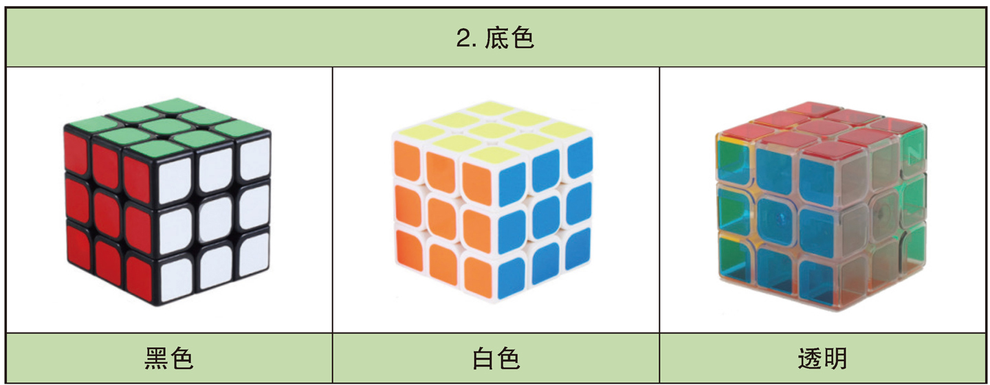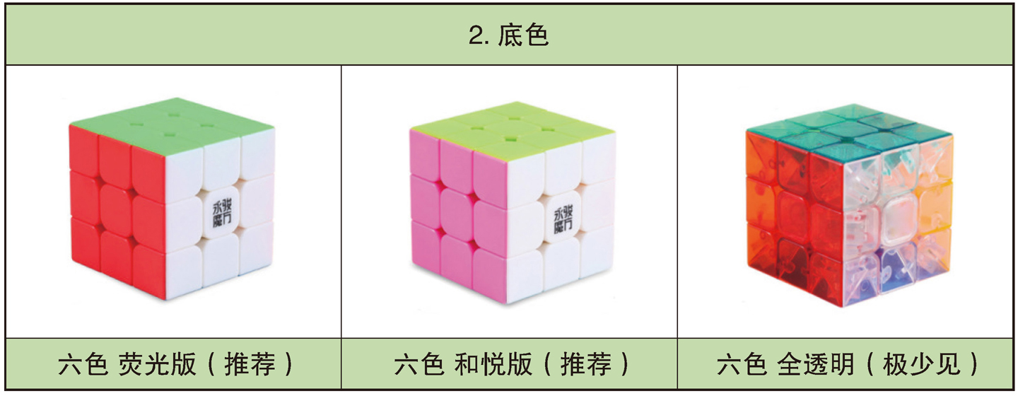 接下来我们看一下魔方的底色。魔方在发明之初其实只有一种颜色,就是把一种颜色的塑料块拼接在一起。只要在魔方每一个面贴上贴纸,魔方就有了不一样的颜色。当然六个面的六种颜色也不是胡乱贴的,这个我们后面会讲。15年前,只有这种贴纸魔方才能参赛,而且不能是透明的。但后来WCA修改规则之后,六色魔方也能用于WCA赛事中。所谓六色魔方,就是塑料的颜色是魔方这一面的颜色,它的棱块和角块都会采用不同颜色的塑料拼接起来,这样的魔方更能使选手注意到颜色而且耐磨损。全透明的魔方很罕见,我只在御龙这款魔方上见过,值得收藏。还有喷漆的魔方,也很少见,有机会看到的话也可以留意一下。