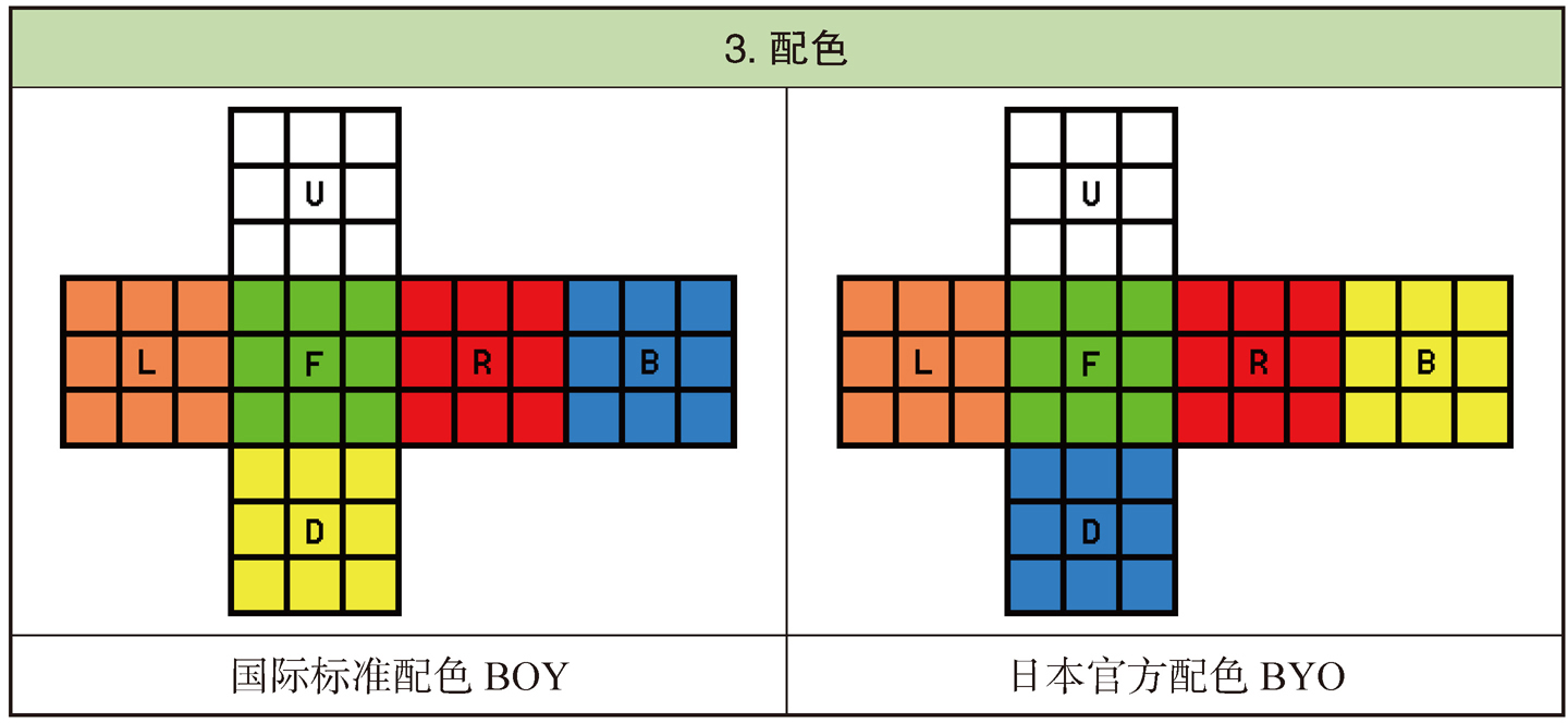 关于配色,我们也需要讲几句。尽管现在世界上的魔方大多是中国生产后出口的,采用的都是国际标准配色。但是魔方发明之初并不是这样的,而是和前表右图一样的日本官方配色。后来根据颜色专家的建议,鲁比克教授改成了“上黄、下白、前蓝、后绿、左橙、右红”这样相近的颜色相对的方案,这样更容易区分色块。世界上只有日本还使用BYO这种配色,在早期日本魔方爱好者中岛悠的魔方教程“中岛非标”中可以看到它的痕迹。
