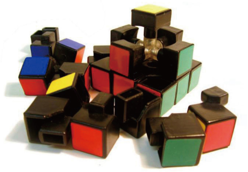 如果我们把魔方拆开来看,就可以看到里面的轴、棱块和角块。上面这个魔方虽然很老,没有很好的容错结构,但是三阶魔方的基本结构在几十年里都没变。角块和棱块都有延长出来的卡角,用于卡入魔方。如果有机会的话我们还是建议拆一下魔方,看看内部结构。拆装魔方的时候都有一些小技巧。如果觉得魔方比较难拆,可以打开任意一面的中心盖,然后适当调松螺丝,取出这一面的色块。装魔方的时候,可以先装好底下的十字棱固定中心块,再塞入第一层的角块,依次往上会更容易装起来。