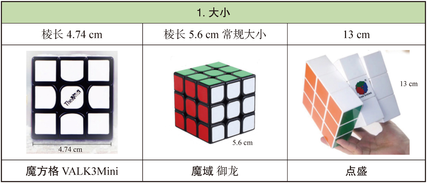 首先我们来看一下魔方的大小。魔方有大有小,既可以小到要用镊子才能转动,也可以大到要两个人才能转动。人们总是不局限于魔方的常规大小,而乐于突破已有的限制。我们在此列举了常见的三种魔方的大小,从上表图中我们看不出它们的大小,但是真正拿在手中的时候,感受还是很不一样的。常规的三阶魔方大小是棱长5.6 cm,这是一个转起来比较舒服,容易操控的尺寸。