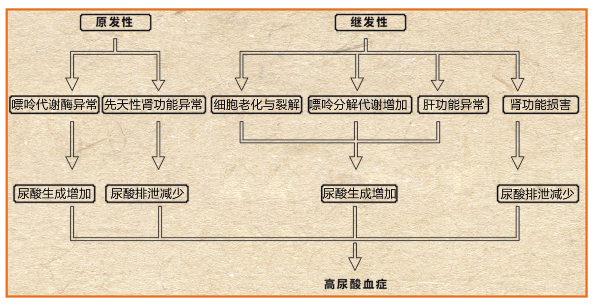 图1-10 肝肾功能异常是尿酸生产过多和排泄减少的主要因素