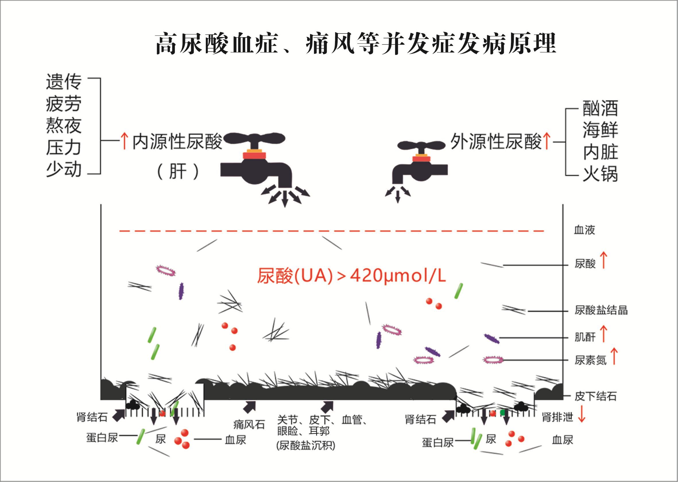 如图1-15所示,当内源性或外源性尿酸来源增加,或肾排泄尿酸功能下降(也可能三种因素同时存在),血尿酸水平升高,持续超过420μmol/L,形成尿酸盐结晶并随血液循环到达全身关节、肾、皮下、血管、耳郭和眼睑等部位并沉积,诱发痛风、心脑血管疾病、痛风石(包括肾结石)等相关疾病,逐渐损害肾功能,出现血尿、蛋白尿,最终由于肾脏排泄肌酐、尿素氮等代谢废物功能下降而发展成为尿毒症。