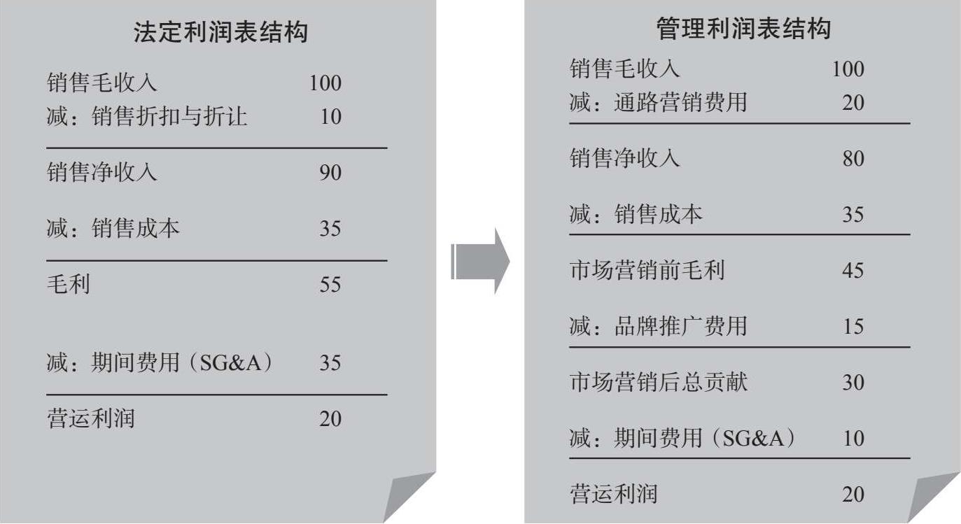 以国际知名食品制造商卡夫与吉百利公司为例,它们的内部管理利润表中会出现两个毛利指标—— 市场营销前毛利 与 市场营销后总贡献 。