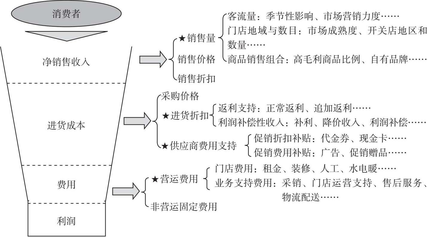 零售行业没有制造环节,但属于消费品制造业的重要分销渠道,因此盈利模式与传统制造业不同,零售企业的利润不仅源于最终消费者,还与供应商即消费品制造厂商有紧密联系。消费品制造企业常常与经销商、零售卖场共同对产品进行市场促销活动,因此零售企业与供应商签订的采购合同中常附有各种商品返利和促销费用补贴,这使零售企业毛利的一部分源于供应商。因此,零售企业的利润中心(如各地理区域的分部或门店)的运营模式和盈利能力分析的着重点,将与表4-1所示的工业品制造业的业务单元有很大不同。