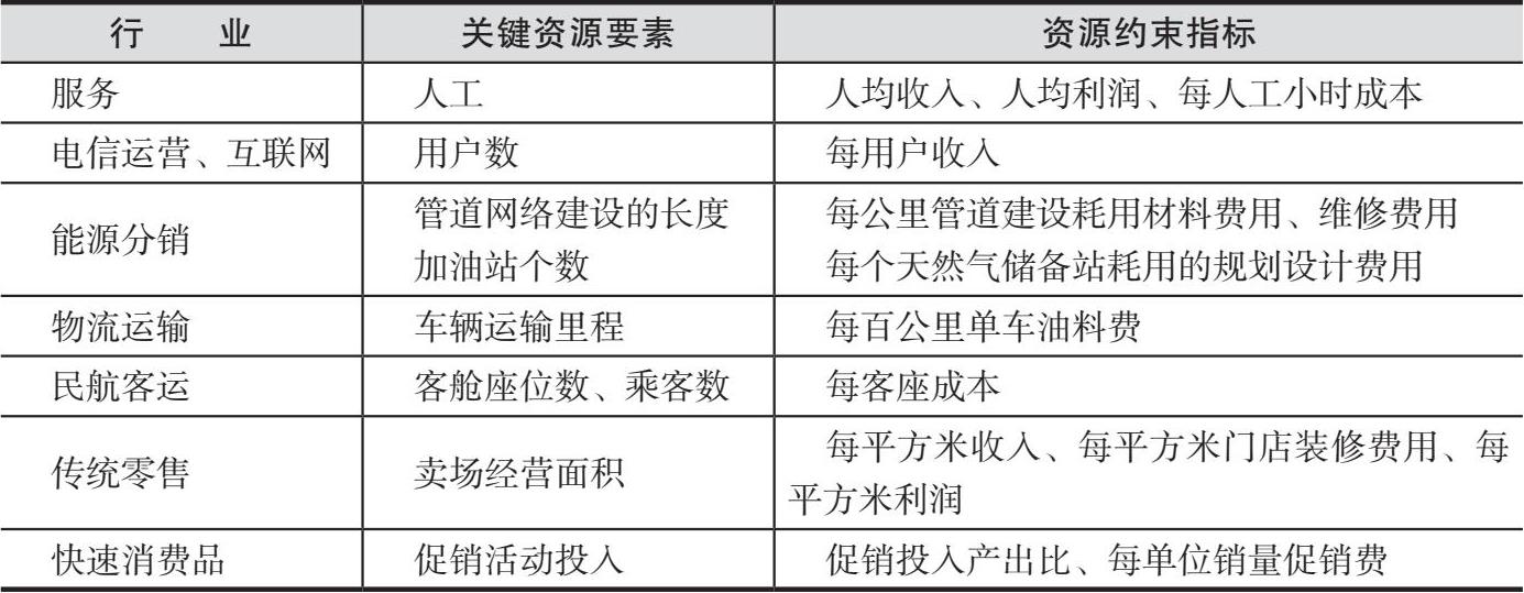 财务分析师在设计经营财务分析指标时,除了需要考虑本企业所在行业的特性和企业不同业务单元的管理特点及管理者需求外,还可以围绕本行业的“ 关键资源要素 ”设计不同的资源约束指标。关键资源要素是指在运营中投入的关键资源项目或驱动收入增长的外部变量,它的总量大小常常意味着企业的生产能力或市场份额。 资源约束指标即指每单位关键资源要素下的 P&L项目金额(收入、费用或利润)。表4-5列出了几个行业的关键资源要素与可选的资源约束指标的示例。