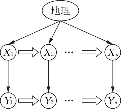 其次是循环累积效应。地理禀赋在历次制度变迁过程中都会发挥其作用。除了制度之外,地理禀赋会影响到初始生产力和初始观念。地缘政治的复杂性在于,结构和过程层面的自变量和因变量都会积累,成为下一期的初始条件。如图2所示,假设地理因素要通过变量X对结果Y起作用,那么实际上地理因素影响第N期结果(Y n )的路径就有N条。因此变量数量的增加、时间的推移、考虑反馈效应(Y n 对X n 的影响)以及考虑变量之间的互动,地理变量影响结果Y的路径会大幅增加,越到后期就越复杂,考虑到变量的自相关特性,想要建立一个统一的模型考察地理对一个国家的影响几乎是不可能的。因此讨论地理和国家命运的机制时,只能够截取特定的时空,将既定的条件作为初始值来进行因果解释,而不是试图得出一个普遍性的结论。