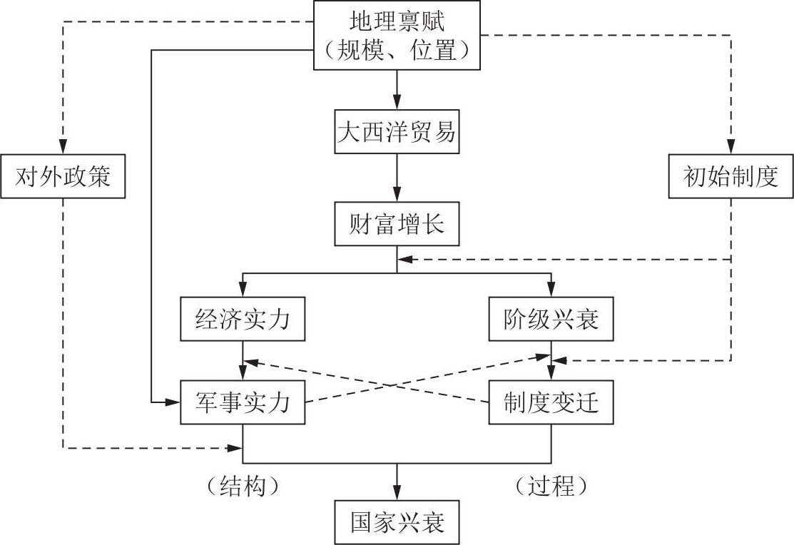 在结构层面,地理大发现后,西欧各国通过直接或者间接方式来获取殖民地的财富,并且将这些财富转化为军事力量,并用这些军事力量去保障、控制和夺取领土、资源与殖民地,从而进一步强化自身的国力,其核心机制为:地理禀赋→大西洋贸易→财富增长→经济实力上升→军事实力上升→大国崛起。影响结构层面核心机制的辅助机制有 3 个:第一,位置和规模影响国家的军事能力。位置对于早期西欧国家的竞争而言是重要的,处于欧洲边缘地区的国家拥有更低的防御成本,而被大国环绕的国家则会被迫将大量资源用于陆上的防御。规模对国家的重要性不言而喻,国家拥有的领土、资源和人口越多,越能够建立更庞大的军队,增加其在国际竞争中的优势。第二,国家外交政策影响其军事竞争力,但地理位置仍然是国家对外政策优先目标的出发点。 偏远的岛国更不容易被其他国家联合制衡,而规模最为庞大的强国则更容易招致周边国家的反对。地理禀赋一定程度地限制了国家的选择,但是决策者仍然具有主观能动性。国家可以通过外交方式来减少敌人和增加盟友。第三,国家内部的制度决定了其将经济转为军事的能力,16 世纪和 17 世纪的战争经常是旷日持久的消耗战,是国家间军事、经济和制度的全方位竞争。税赋承受力和借款成本影响到国家的长期作战能力,这两者都受到制度的影响。实施宪政的国家拥有可预期的财政政策就能够通过降低借款成本来增加竞争力,而国家内部政治参与度则影响了国民对税赋的承受能力。