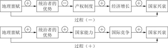 在过程层面,地理的便利是大西洋贸易的重要前提,早期参与大西洋贸易的都是欧洲滨海国家。大西洋贸易带来的外部冲击影响到了国内阶级力量的消长,最终促进了国内的制度变迁,通过建立高效的制度来促进国家的崛起,其核心机制为地理禀赋→大西洋贸易→财富增长→商人阶级壮大→制度变迁→大国崛起。 影响其核心机制的辅助机制有两个:第一,国家的初始制度会影响商人阶级的兴起和国家政权性质的变化。 如果早期是较强的专制,统治者会获得大西洋贸易的绝大多数收益,商人阶级会形成对统治者的依附;如果早期是较弱的专制制度,商人阶级会获得大部分贸易收益,从而不断壮大形成新的制度需求,进而有助于商人阶级在国内斗争中获胜。第二,国家军事能力的增加会阻碍制度变迁的过程,拥有大规模的常备陆军会增加商人阶级通过抗争来实现制度变迁的难度。早期国家拥有的常备陆军的数量和比例很大程度受到地理环境的影响,王室对于海军的控制能力要弱于陆军,陆军规模的增长更有利于中央集权。因此地理禀赋对于制度变迁的影响在于,规模过大和面临陆上威胁将不利于国家发展出宪政制度。