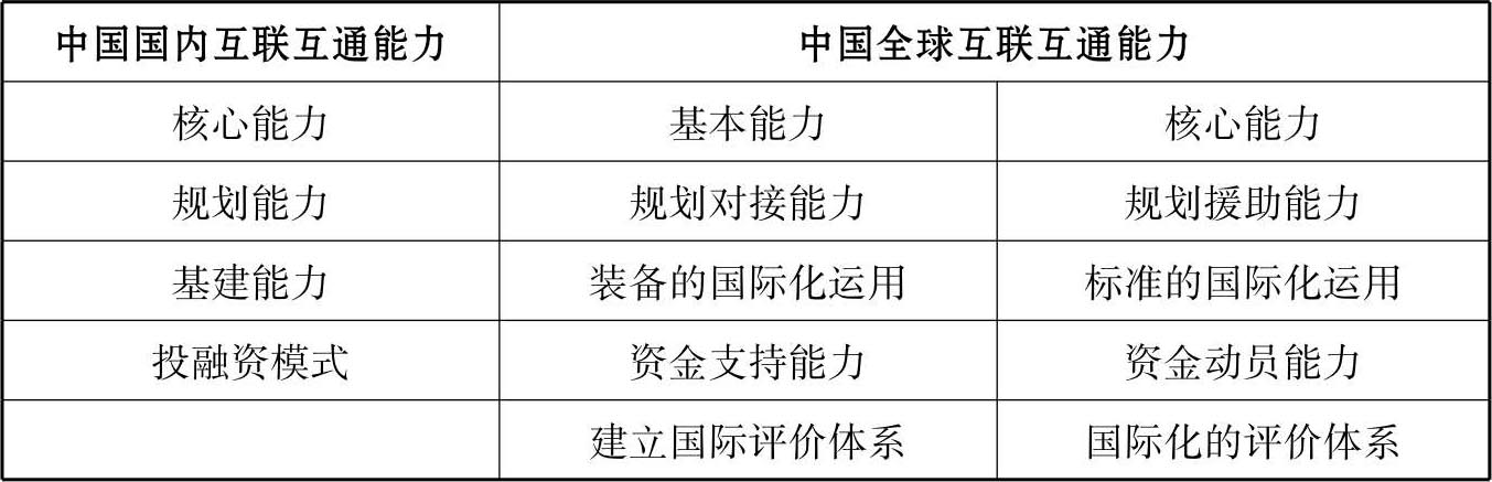 全球互联互通能力反映出大国为国际社会提供高质量互联互通产品的能力。结合中国国内互联互通能力和中国全球互联互通产品供给,可以拓展与延伸出中国全球互联互通的基本能力与核心能力,其中,全球互联互通的基本能力包括规划对接能力、装备的国际化运用、资金支持能力、建立国际评价体系,这是中国为国际社会提供全球互联互通产品的初级阶段,是中国积极平等介入全球互联互通进程、融入全球互联互通事业的第一步。全球互联互通的核心能力包括规划援助能力、标准的国际化运用、资金动员能力、国际化的评价体系,这是中国全球互联互通产品供给的高级阶段,是中国引领世界互联互通进程的阶段,是中国作为全球型国家追求的目标。