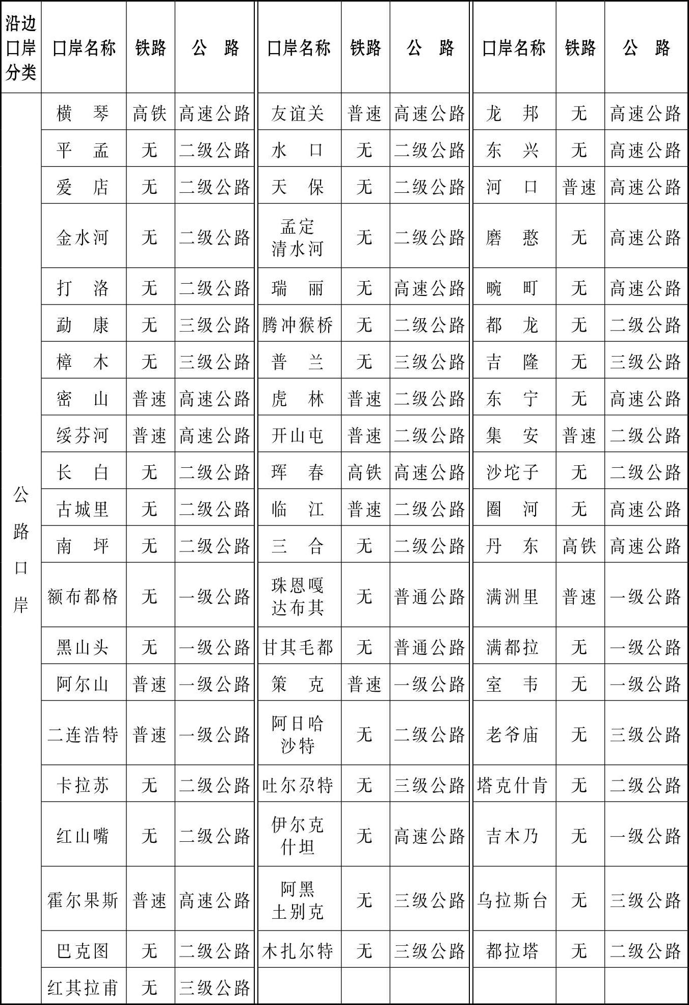 高速铁路、高速公路、机场基本上处于国家中心地区,不少国家在这些地区之间往往互联互通程度较高,但中心与边境却未能有效连接。互联互通不仅是中心地区之间的连接,也是全国整体性的联通。“联通到边界”成为考察一国互联互通程度的另一个面向。口岸是国际对外开放的门户,人员和经贸往来的桥梁,连接和利用两个市场、两种资源的重要渠道。但一些公路和铁路口岸往往地处交通闭塞、经济欠发达地区,其设施水平就成为互联互通能力的重要体现。截至 2015 年年底,中国已拥有 295 个一类口岸,其中,铁路口岸 20 个、公路口岸 70 个。 “十二五”规划期间,为适应对外开放新形势新要求,中国不断加大口岸建设。其一,建设或升级一些新口岸。2011 年,勐康口岸正式建成,被国务院批准为一类口岸;2014 年,集安口岸升格为国家对朝一类口岸;2016 年,平孟口岸在历经 5 年改造后正式开通,升级为对越一类口岸。其二,增强口岸通过能力。满洲里口岸是实行 24 小时通关的国际口岸之一,经过扩建,年通关设计能力达到 1 000 万人次,车辆120 万辆,货物 600 万吨; 绥芬河口岸在 2012 年整体改造后,过客能力从年 100 万人次提升至 600 万人次,铁路年过货能力由不足 1 000 万吨提升至3 300 万吨。 其三,加强与边境口岸的设施联通。通向口岸的公路基本达到三级以上,大部分口岸联通了铁路,有些还接入高铁(见表 2)。今后几年,中国还将续建、开建和规划更多连接边境口岸的铁路和公路,并对现有的等级公路和铁路进行升级,推动更大范围和更高程度的互联互通。