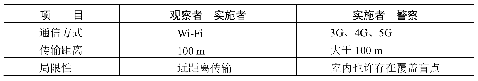 在我们这个场景下,“摧毁者”的行为要受到“观察者”控制。因此,“摧毁者”和“观察者”之间是近距离通信,采用近距离通信方式即可,如百米传输距离的Wi-Fi技术。“观察者”和警察之间有可能是远距离操作,因此合适的通信方式是远距离通信方式,如3G、4G、5G。