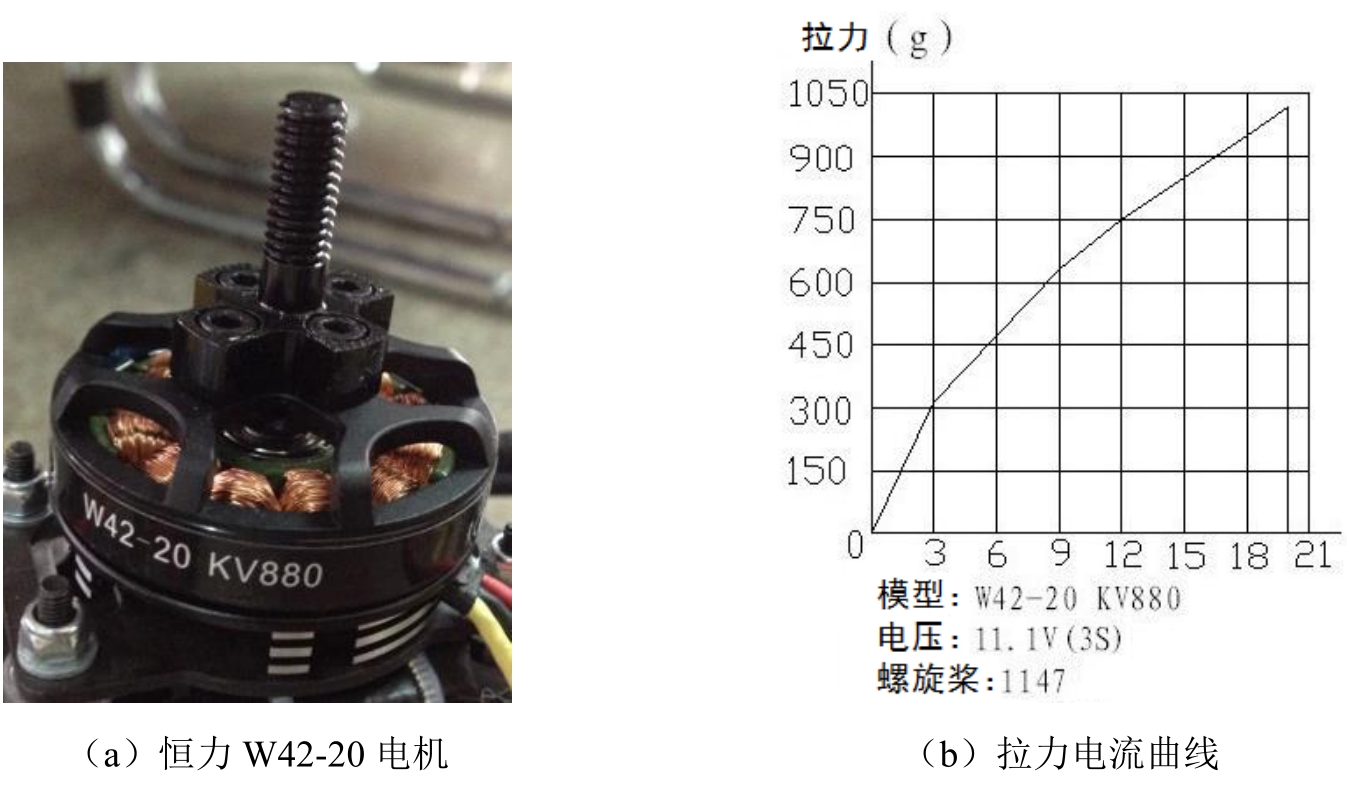 考虑到整机的设计质量在2 kg左右,而无人机必须具有一定的推重比才能保证在大角度机动与高速运动时的性能控制。综合电机的负载能力、重量和效率等多方面因素,最终选用恒力W42-20 KV880外转子无刷直流电机。