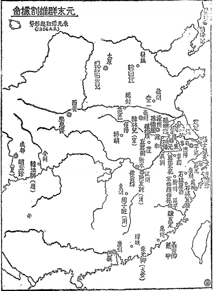 元璋据应天后,他的疆域以应天作中心,西起滁州,划一直线到芜湖,东起句容到溧阳。西边长,东线短,一块不等边形,横摆着恰像个米斗,西线是斗底,东线是斗口。四面的形势是:东边元将定定扼守镇江;东南张士诚已据平江,破常州,转掠浙西。东北面青衣军张明鉴据扬州(今江苏江都);南面元将八思尔不花驻徽州(今安徽歙县),另一军屯宁国(今安徽宣城);西面池州(今安徽贵池)已为徐真逸所据;东南外围则元将石抹宜孙守处州(今浙江丽水),石抹厚孙守婺州(今浙江金华),宋伯颜不花守衢州(今浙江衢县)。元璋局面小,兵力也不强,处境呢,真是四面受敌。