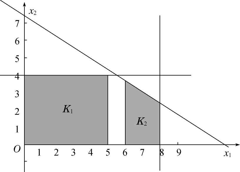 同一问题分解出的两个分支问题称为“一对分支”。做出问题 A 1 , A 2 的伴随规划 B 1 , B 2 ,则问题 B 1 , B 2 的可行域为 K 1 , K 2 ,如图3.2所示。