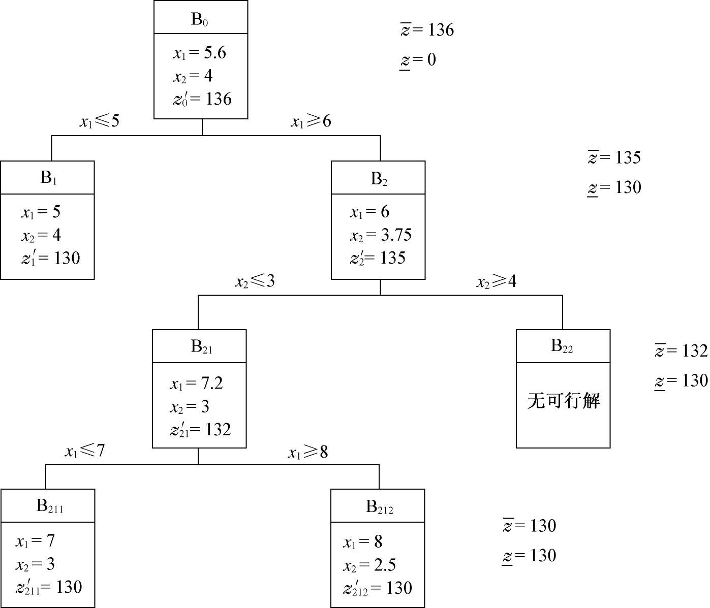在20世纪60年代初,Land Doig和Dakin等人提出了分支定界法。由于该方法灵活且便于用计算机求解,所以目前已成为解整数规划的重要方法之一。分支定界法既可用来解纯整数规划,也可用来解混合整数规划。