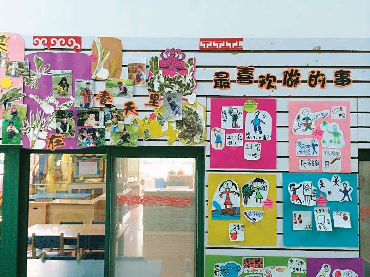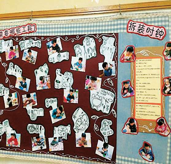 例如中班环境“拆装时钟”,幼儿拆装时钟的照片、幼儿绘画拆装时钟的工具、拆装时钟活动中的对话,被老师记录剪切装饰后布置在教室里,充分体现幼儿参与性原则。大班环境“最喜欢做的事”,幼儿将自己喜欢做的事画下来或者拍下照片,教师组合装饰后布置在教室环境中,充分体现幼儿参与在环境创设中的主体地位。