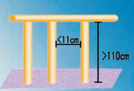 保护幼儿的安全健康是幼儿园的首要责任,也是贯彻“保教并重”原则的重要措施。幼儿园环境的安全主要包括两个方面:物质环境的安全和精神环境的安全。物质环境的安全是指幼儿园所有设施设备器具必须以保障幼儿人身安全为前提。例如,幼儿园栏杆宜用竖栏,高度不低于 110 cm,栏杆与栏杆之间宽度小于11 cm,以防幼儿攀爬造成危险(图 1-10)。如果加上横栏,就容易引发幼儿攀爬的意外事故(图1-11)。