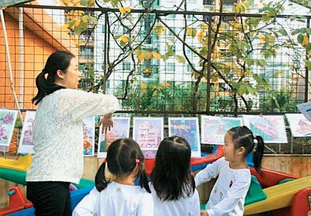 图1-19 幼儿园教师与幼儿讨论环境创设