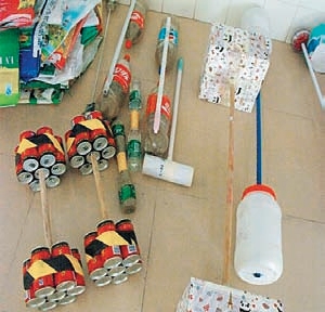 在户外游戏环境创设中,幼儿园教师和幼儿一起收集废旧材料,自制户外活动玩具,是很好的环境创设举措,符合经济性原则。但要同时注意符合安全性原则,安全无毒,保护幼儿身体不受伤害(图 1-13、图 1-14)。