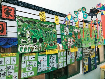 例如,南京某所幼儿园根据南京是军区所在地的地方特色,开展了“绿色军营”主题活动(图 1-9),环境创设充分体现了幼儿对军营的认识,符合开放性原则。