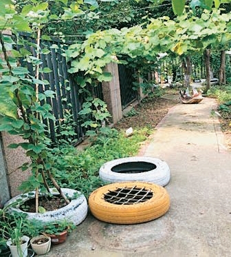 图 1-17、图 1-18的户外环境创设中较好地体现环境与教育目标一致性原则幼儿参与性原则、安全性原则、经济性原则及审美性原则。试想在和煦阳光中的丝瓜藤架下,幼儿坐在废旧轮胎的“椅子”上,拿着画板画着他看到的一切大自然美妙的东西,这是何等的惬意!幼儿可以在幼儿园的土地上耕耘,洒下种子,浇水除草,看着植物发芽生长,在照顾植物生长的过程中,感受生命变化的奥秘,这是人类智慧获得的过程,也是大自然赋予人类的权力啊!