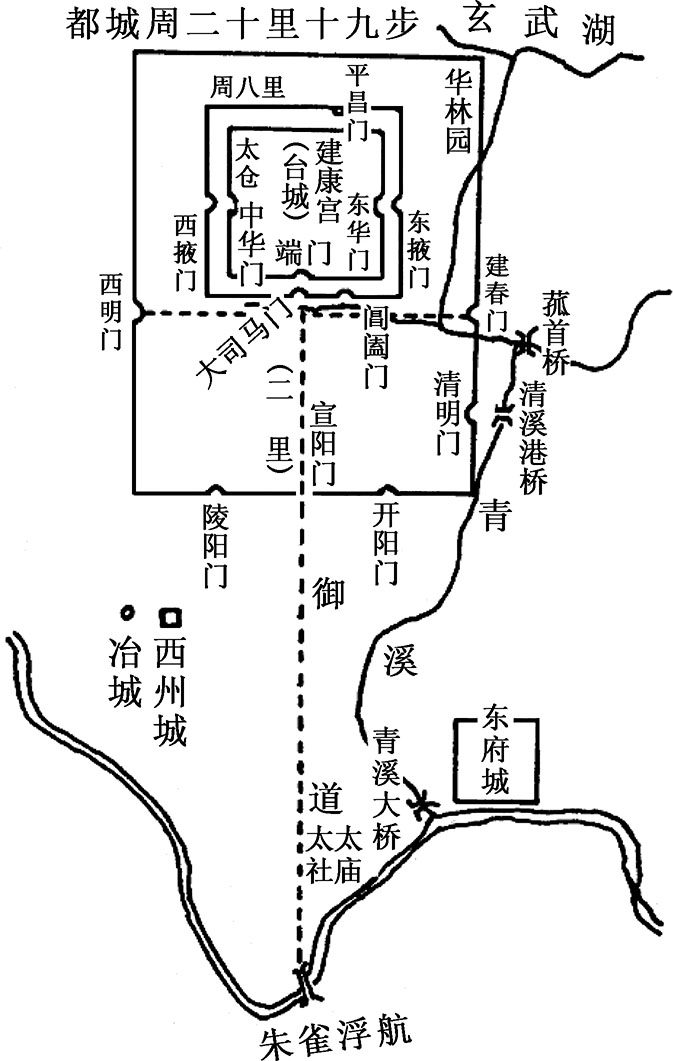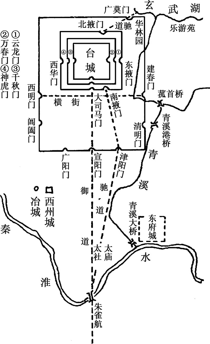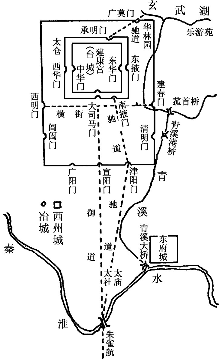 说明:① 朱偰《南朝都建康总图》所标东府城离秦淮河尚有一段距离,且其面积几与台城相等,实则东府临秦淮河,而且面积约等于台城的三分之一,台城周八里,东府仅三里余。