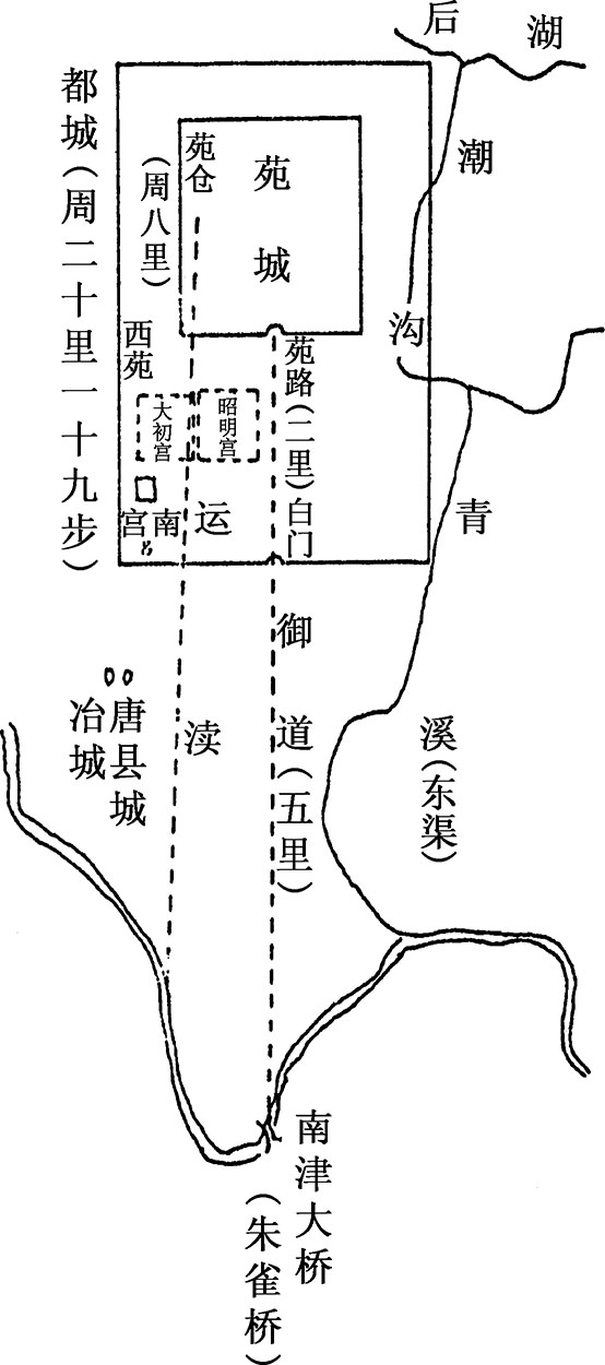 ② 《建康实录》卷二云吴苑城(即晋之台城)内有仓,名苑仓,其地在后来的西华门内道北,又称吴开运渎,自仓城抵秦淮河。又卷九云晋太子宫在台城西南,西逼运渎,故知运渎当偏于苑城及台城之西半部,朱偰图运渎起源潮沟,经苑城东半部,根本没经过苑仓,不确。然运渎确实的路线亦不能得知,今仅以虚线标出其约略之路线。