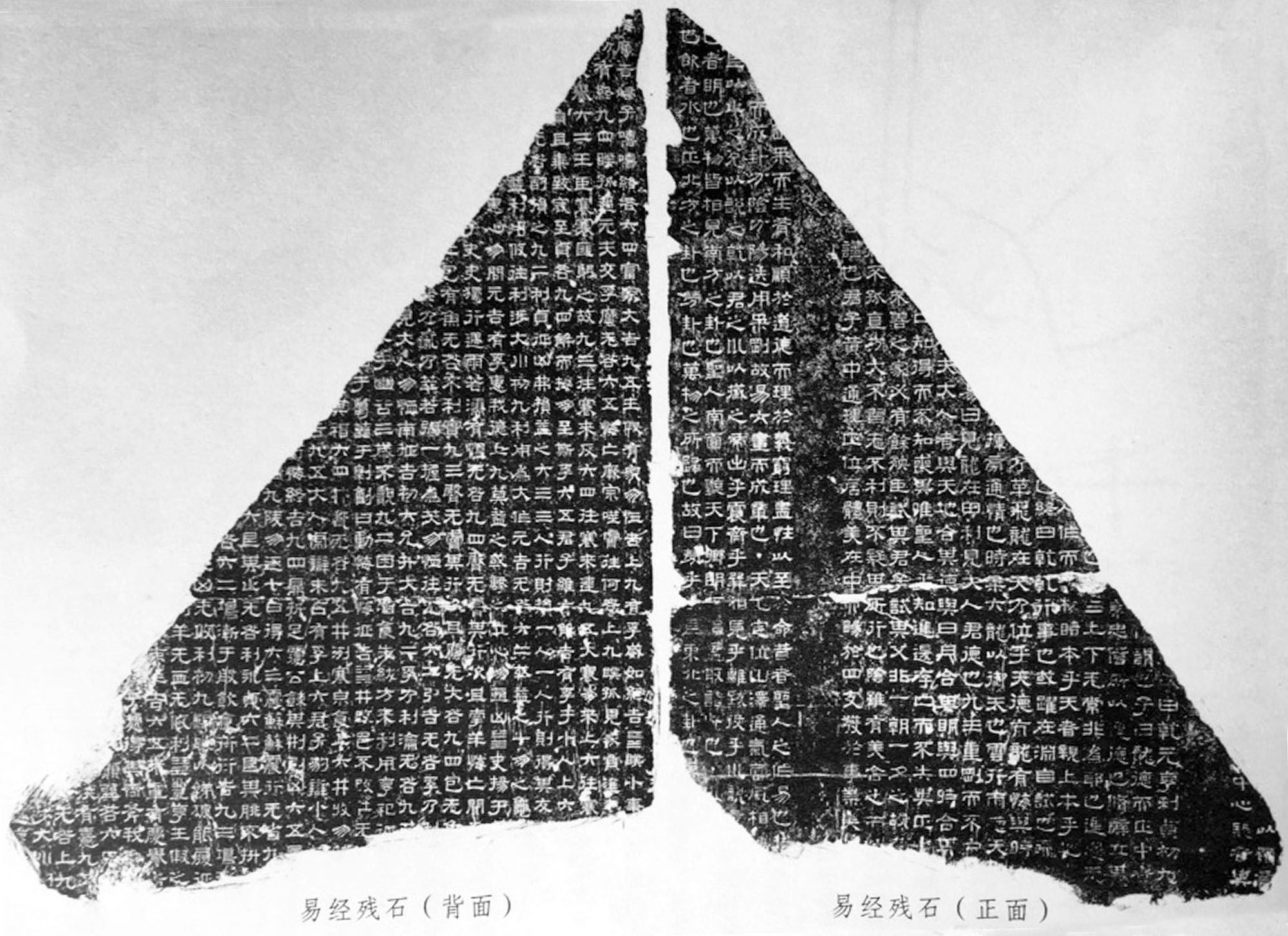 一九二八年,洛阳朱疙瘩村出土大凷熹平石经《周易》残石,正面为下经《家人》之《小过》等二十六卦五百三十余字,背面为《系辞》《文言》《说卦》,存四百二十余字。