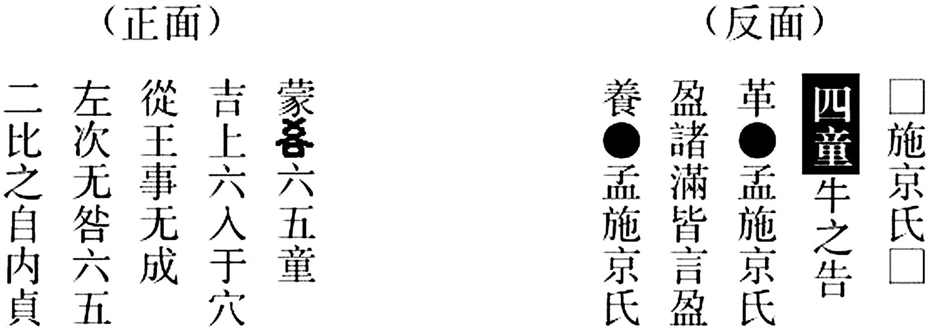 1944年,屈万里从国民党元老张溥泉处获汉熹平石经《周易》一残石拓本,正反两面,正面为经文,存二十八字,反面为校勘记,存二十四字(其中“四童”两字残泐,漫漶不清)。碑式文字如下: