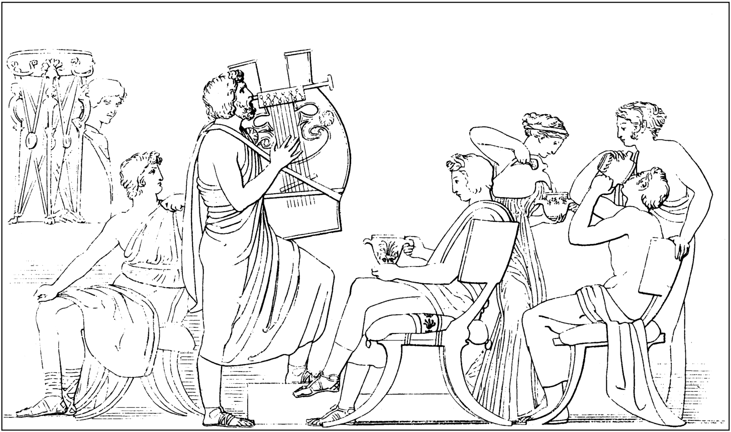 求婚子弟们吃饱喝够,兴趣就转到另一方面;他们想听音乐和歌曲,那些娱乐是宴会的冠冕;一个侍从把美妙的鸣筝放到菲弥奥手里,强迫他在求婚子弟面前歌唱,他就开始弹筝,准备唱个美妙的歌曲。这时帖雷马科对明眸女神雅典娜讲了话,他的头靠近女神耳边,免得让旁人听到;“亲爱的客人,希望你对我说的话不见怪。这些人现在又要欣赏鸣筝和歌曲这些娱乐了;他们毫无顾虑,无偿地消耗别人的家财,不管这家主人的白骨是否横陈在地上被雨泡烂,或是在海里随着波浪漂浮。如果他们能看到他回到伊大嘉岛,他们那时就要祷告天神,希望能跑得更快一些,不想占有更多的黄金和衣饰了;可是现在我们已经绝望;他一定已经不幸死掉;虽然世上还有人说他还会回来,我看他是不会还乡的了。可是请你告诉我,要老老实实地对我说,你是什么人?从哪里来的?居住什么城镇?你的父母是谁?你坐的什么船?航海的人怎样把你带到伊大嘉的?他们又自称是什么人?我看你总不会是步行来的。还有请你老实告诉我,让我弄明白;你是第一次来这里呢,还是从前就做过我父亲的客人?因为许多客人都到过这里,正如我父亲自己也访问过许多地方的人一样。”