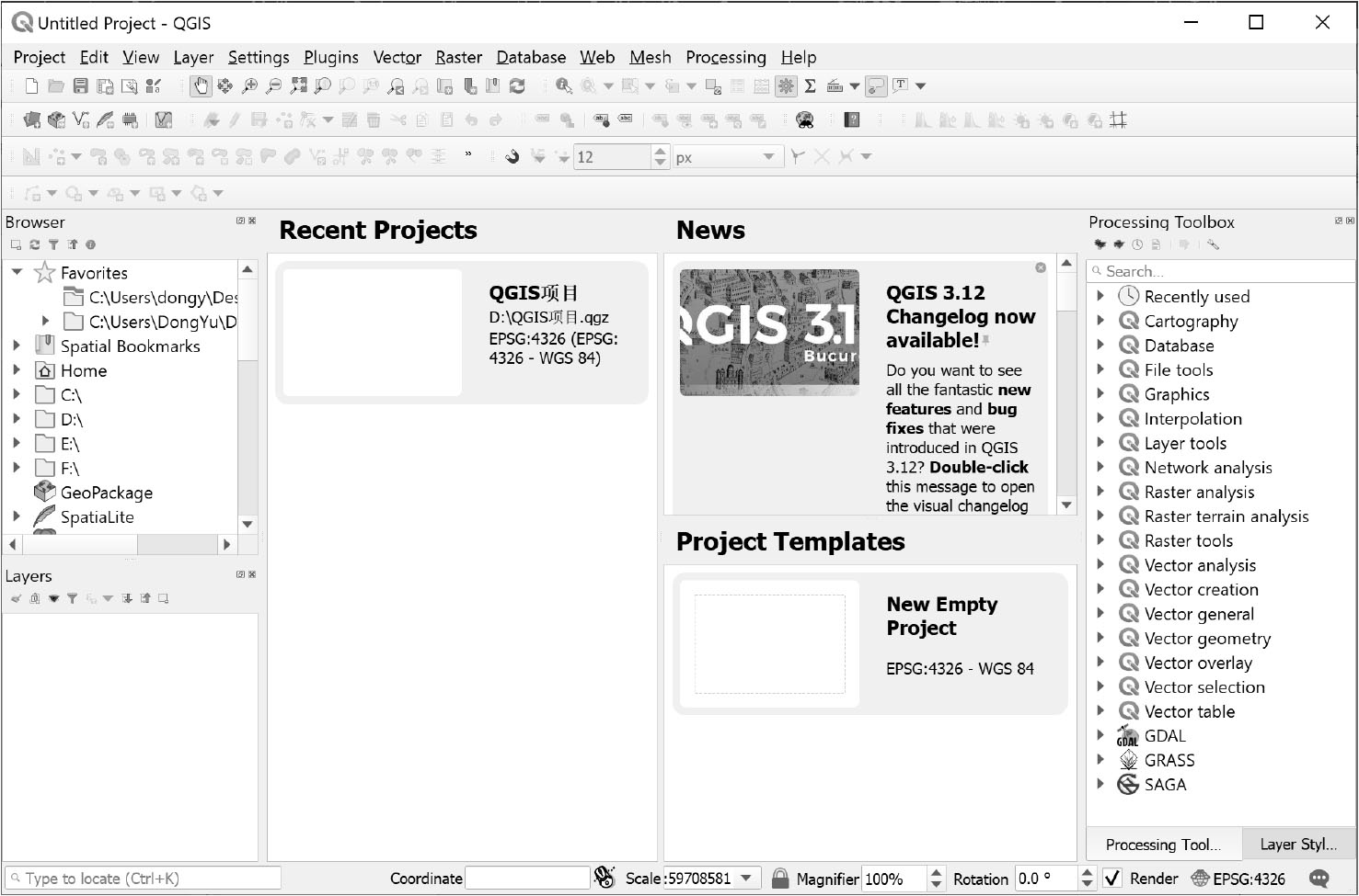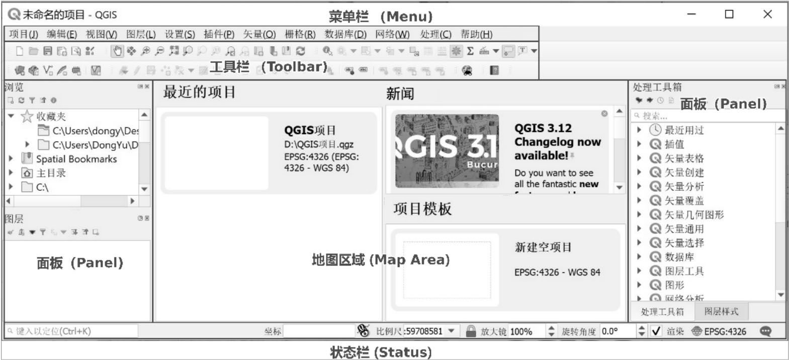 · 地图区域(Map Area):地图画布显示区域,是QGIS最重要的界面区域,用于显示由至少一个图层组成渲染的地图,是地图制图和空间分析的可视化工具。在QGIS启动时,地图区域分为最近的项目(Recent Projects)、新闻(News)和项目模板(Project Templates)三部分:最近的项目帮助用户打开最近使用的QGIS项目;新闻显示QGIS官方的新闻;项目模板显示所有的项目模板,并包含新建空项目(New Empty Project)的快捷选项。