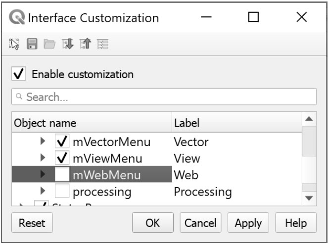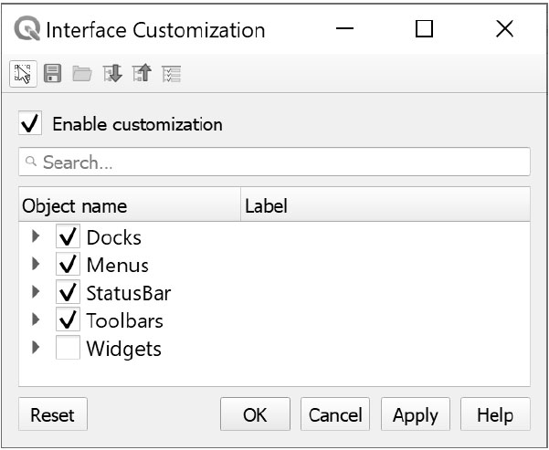 · Widgets(部件):启用或停用各种QGIS对话框的选项卡、按钮、输入框等。