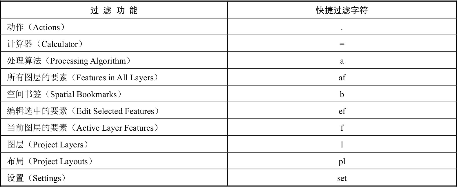 按钮并在弹出的菜单中选择过滤器,可以快速打开QGIS某一方面的功能。另外,也可以通过输入快捷过滤字符过滤QGIS功能。定位器的过滤功能与快捷过滤字符如表2-5所示。