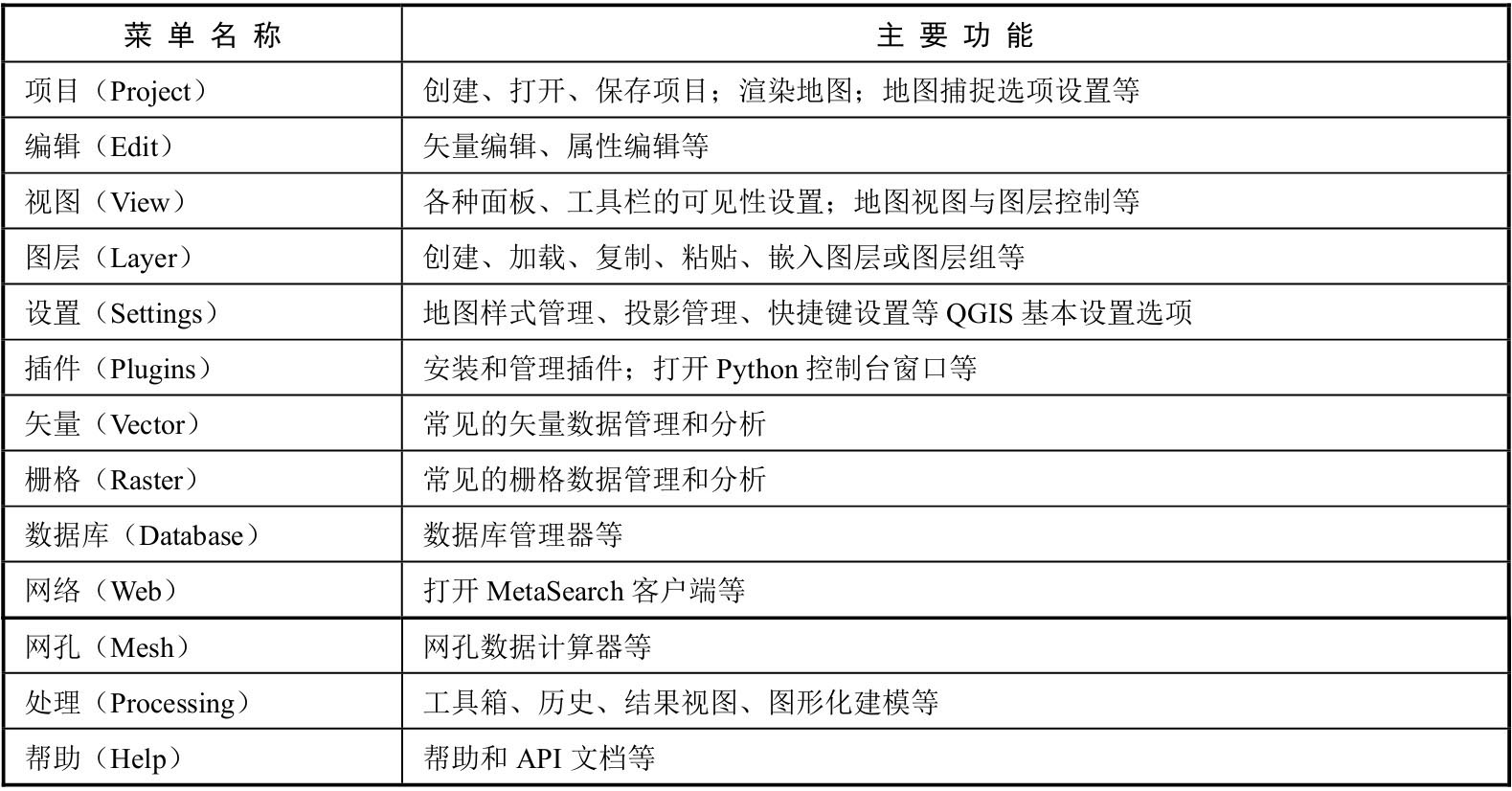 在默认情况下,QGIS共包括项目、编辑、视图等13个主菜单,各个主菜单的主要功能如表2-3所示。